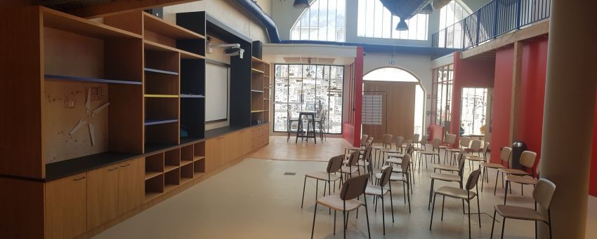 L'espace est composé de deux sections : un grand espace polyvalent pour y organiser des réunions, des ateliers, des discussions. Cet espace est équipé d'enceintes et d'écran qui permettent également la diffusion de photos ou de films. Il est accessible gratuitement aux habitant(e)s.